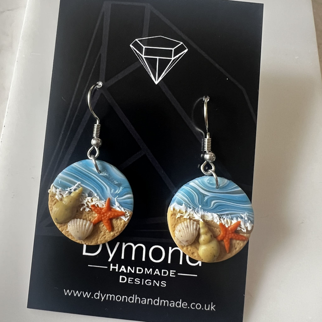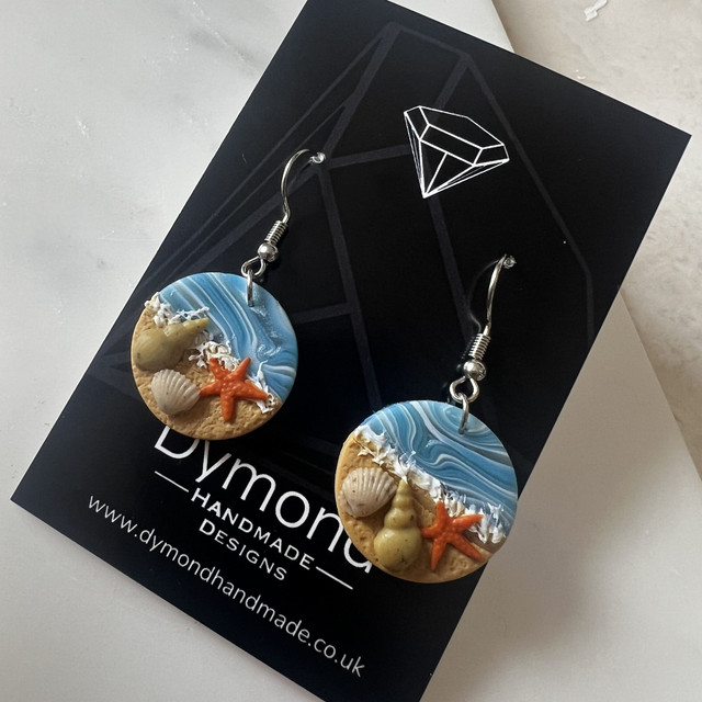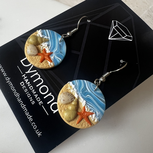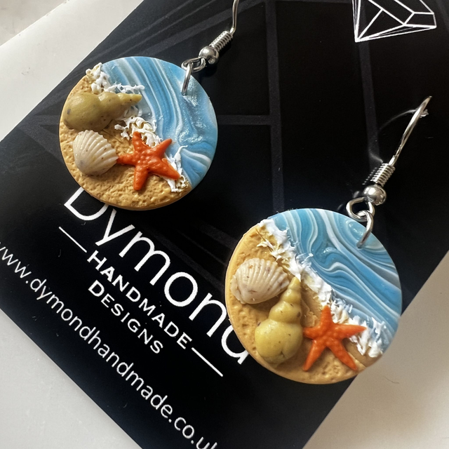 Bring the beach with you wherever you go with these stunning polymer clay earrings featuring a serene beach scene complete with a beautiful starfish and delicate sea shells.