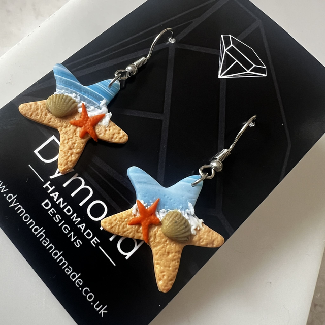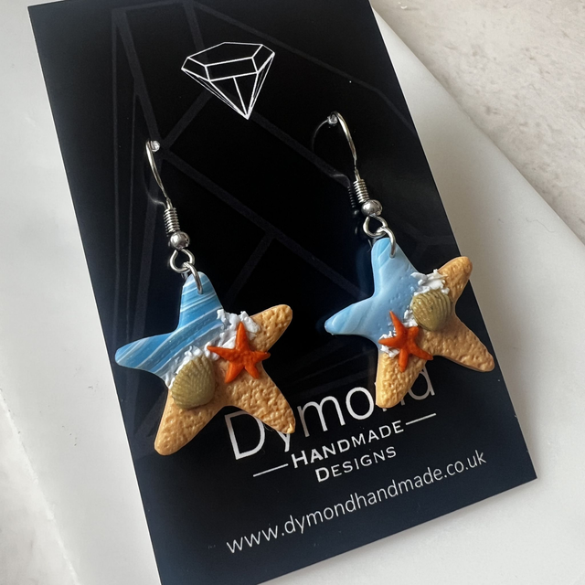 Bring the beach with you wherever you go with these stunning polymer clay earrings featuring a serene beach scene complete with a beautiful starfish and delicate sea shells.